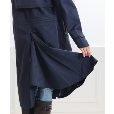 鞍に跨って馬に乗るので、どうしても直立している時よりもレインコートの足部分の可動域が広がります。この開きのおかげで足が動きやすく、指示も出しやすく乗りやすくなります!
